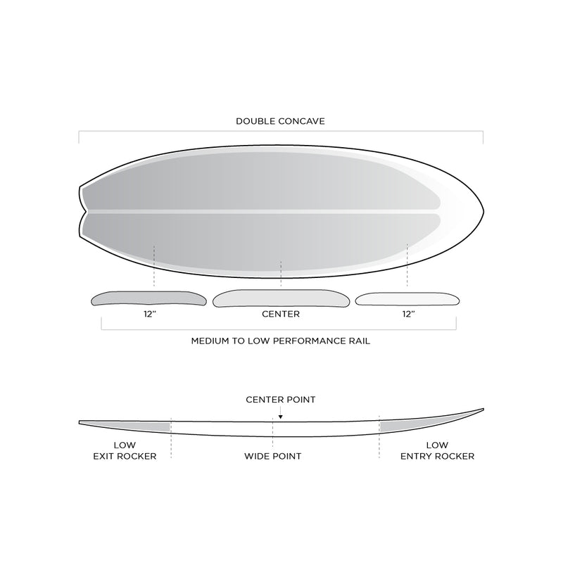 Think small wave grovel, fast and fun. No-paddle takeoffs, buttery floaters. The Sweet Potato is probably the widest, flattest, thickest small wave surfboard you will ever surf. It's high performance but it's definitely a groveler, this shape is the absolute most fun you can have in really bad waves. It's the board that should never leave your trunk.
