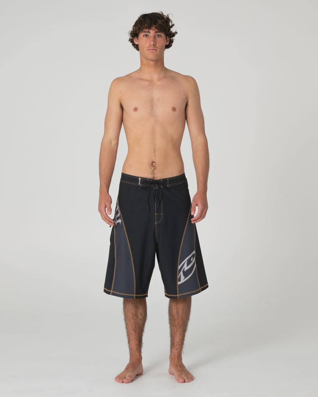 Baggy Fit - Long Length 24" Inch Outseam Fixed Waist Boardshort With Panelling And Gothic Print. 52% Polyester / 38% Recycled Polyester / 10% Spandex 4 Way Stretch