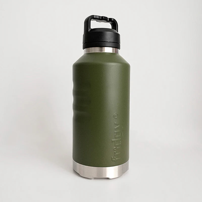 Our new range of 1920ml stainless steel insulated Fridgy bottles are currently our largest bottle in the Fridgy range. Like all our bottles the 'Fridgy All Dayer' is designed to keep your drinks cool for the entire working day no matter what the outside temperature and because this bottles holds nearly 2L of water it is perfect for the outdoor worker in you. For most there will be no need to refill during the day and that why we called it the 'All Dayer'. Like all our bottles the 'All Dayer" is tough and durable and will stand up to the toughest of treatment. Pick you colour, pick between our custom made Fridgy cap or sipper lid and then why not customise it with your name so no one will mistakenly think your Fridgy bottle is theirs.